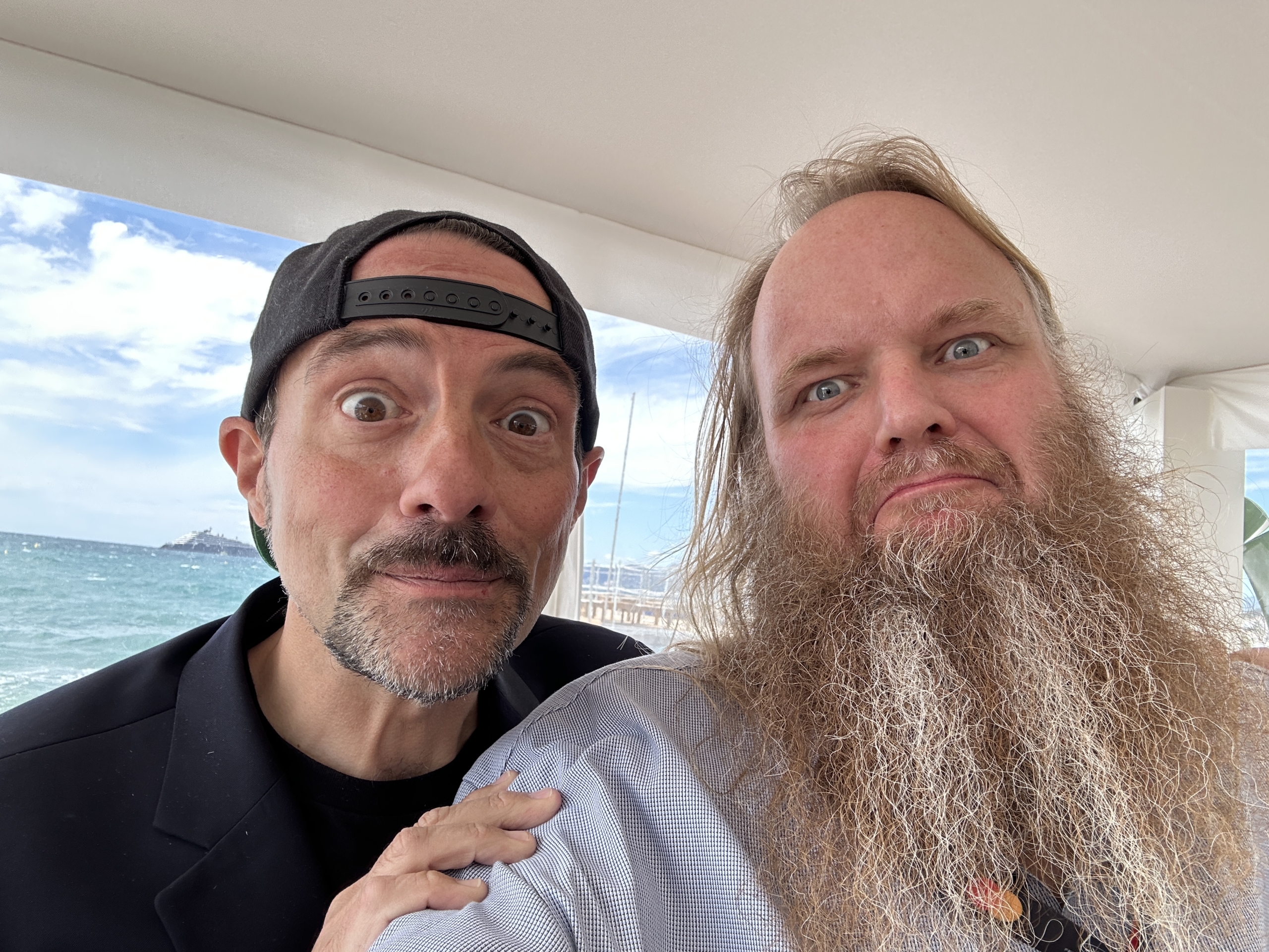 Det er med instruktør, podcaster og entreprenør Kevin Smith. Ham har jeg gerne villet møde siden 1994, hvor hans første film, Clerks, havde premiere. Det lykkedes så 30 år senere i Cannes, hvor der var repremiere på hans religiøse satire, Dogma, som også havde sin oprindelige verdenspremiere i Cannes.